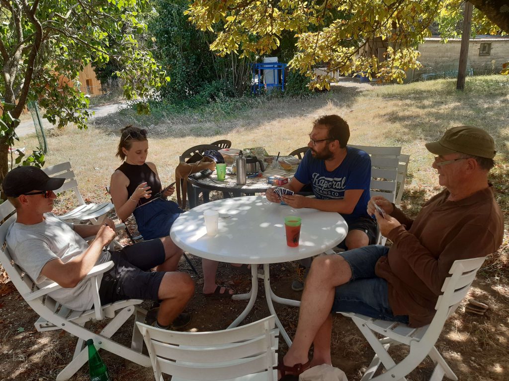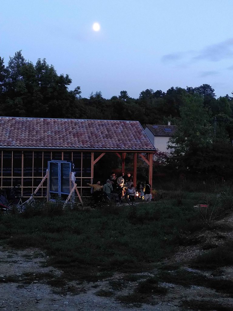 Apéro chantier du vendredi soir sous le préau de la salle commune ! La lune et les copains pour nous accompagnent 🙂